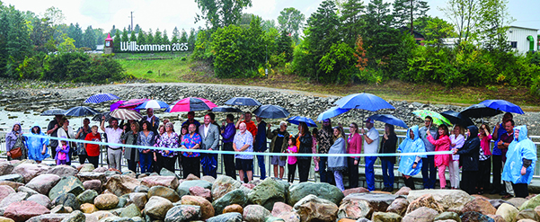 WELCOMING THE WILLKOMMEN SIGN! The Frankenmuth City Beautification Committee, through the auspices of the Frankenmuth Chamber of Commerce and Convention & Visitors Bureau, held a ribbon-cutting ceremony Wednesday afternoon, September 24, for the new and improved Willkommen sign located on the west bank of the Cass River. The CBC also celebrated its 70th birthday as the community's leading organization in keeping Michigan's Little Bavaria beautiful all year long. (News photo/John Cook)